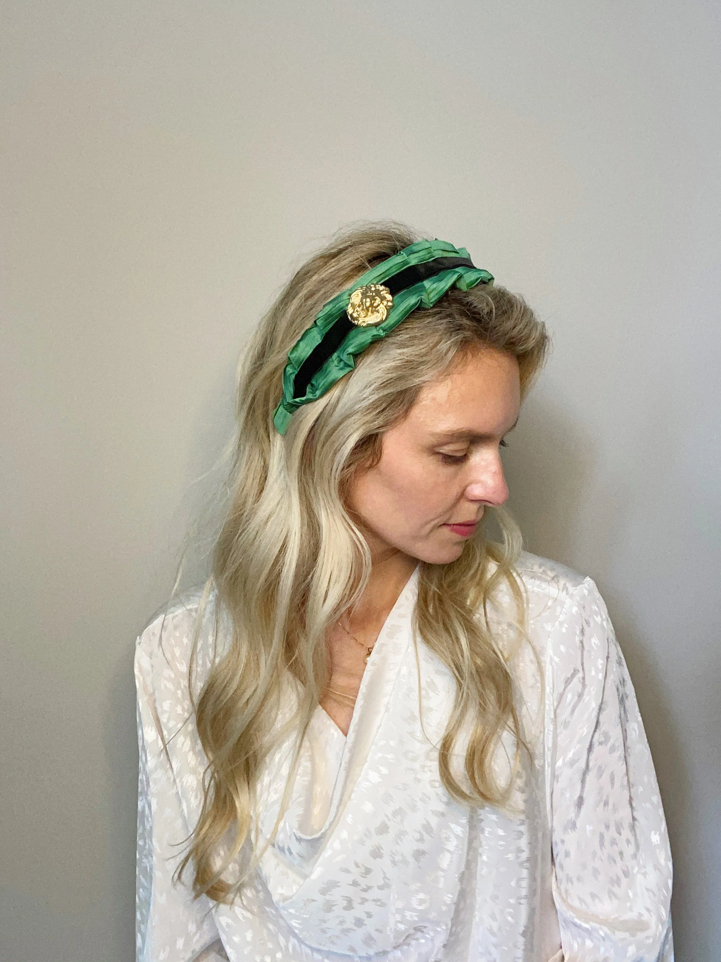 Made with beautiful emerald green pleated fabric. Delicate folded ribbon design, embellished with black velvet ribbon and a vintage gold lion. Rum & Garb designs headpieces to be so comfortable to be worn all day for all casual or special occasions.